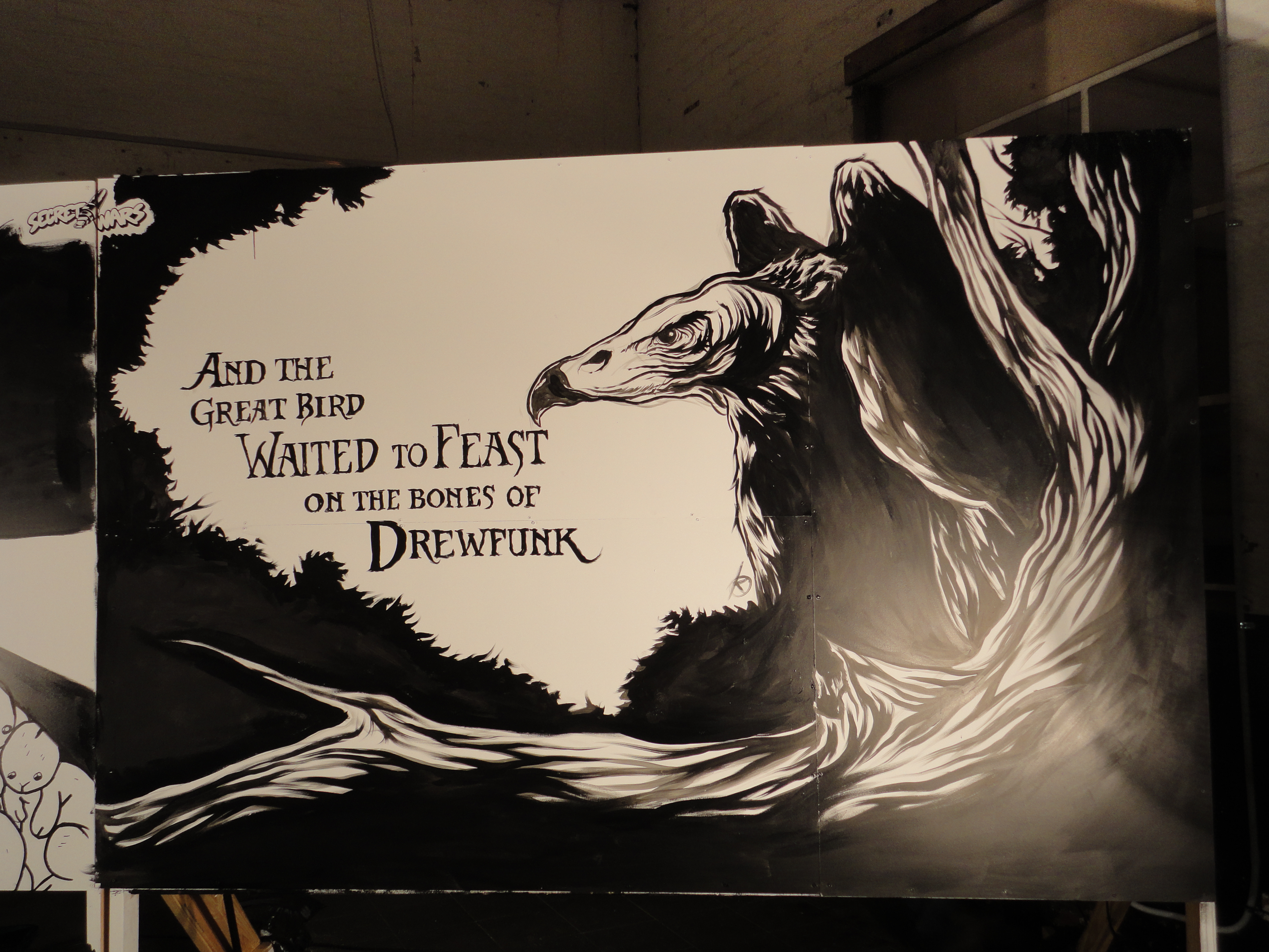 however, what makes this war that much more enticing is knowing one of the combatants. i work with ken taylor in the warehouse studio where i work out of. one of melbourne’s most in-demand illustrators and designers, taylor has made a name for himself in the music industry, an edgy curator whose work boasts rock posters for eddie vedder, grinderman and queens of the stone age as well as album cover art for the likes of mammal and liz stringer. voted the 2011 people’s choice award, watching taylor’s talent unfold live is like watching gothic revival in a slow dance. freakin’ unbelievable.