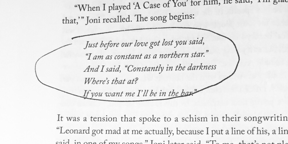just before our love got lost you said / ‘i am as constant as a northern start’ / and i said, ‘constantly in the darkness / where’s that at? / if you want me i’ll be at the bar’ (joni mitchell, a case of you)