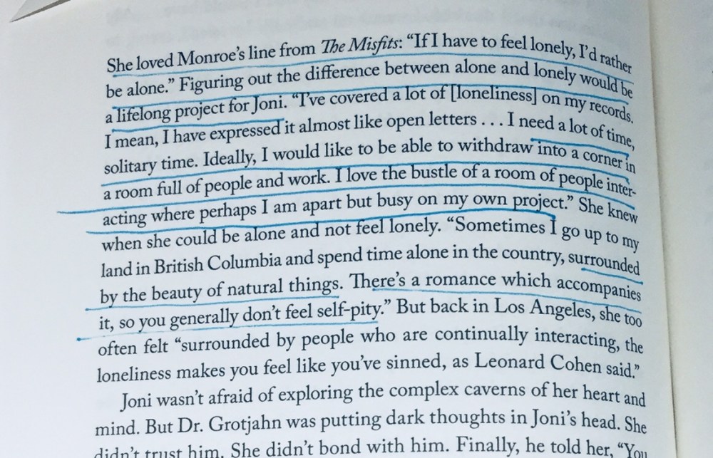 the most powerful prose from the book for me is joni’s realism that feeling blue is more than a song title: “depression can be the sand that makes the pearl … most of my best work came out of it. if you get rid of the demons and the disturbing things then the angels fly off, too. there is the possibility, in that mire, of an epiphany.” i also discovered a new mantra when it’s revealed that joni renamed a song called “traveling” to “hejira”, which means to escape with honour. traveling is that – to escape honourably only to return with honest intentions.